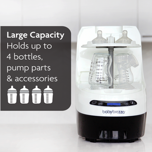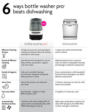 - Automatically washes, sterilizes & dries bottles, pump parts and sippy cups. Never use a bottle brush again!