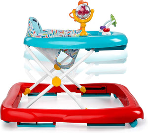 A high seat back provides comfort and support. The design of this baby walker allows for easy fold, storage and portability. Easy to keep clean by wiping it down where needed and tossing the seat cushion into the washing machine. It is safety enhanced with rubber feet that "brake" and a sturdy frame.