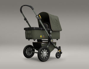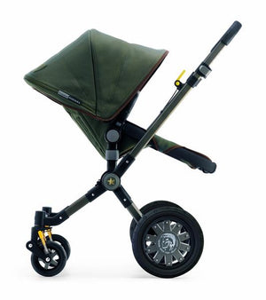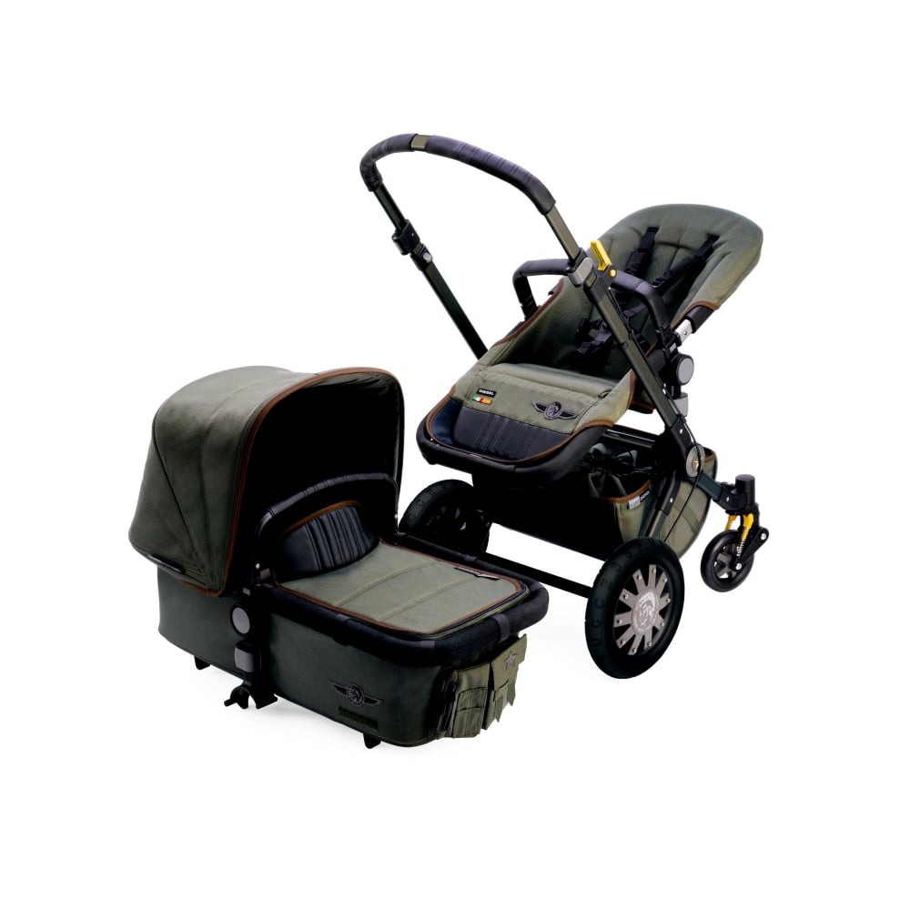 The military-inspired statement pushchair comes with a dark green anodised chassis complemented by an all-over green canvas with sophisticated black and brown contrast trims, custom logo patches and a soft interior.