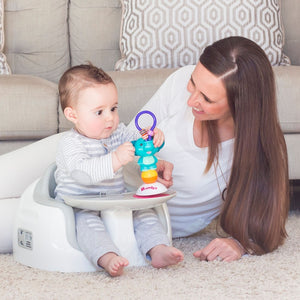 the Bumbo® multi seat tray is easily detached and manoeuvred with one hand to stow away neatly in its slot behind the backrest of the seat.