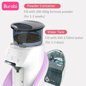 - AUTOMATIC BABY FORMULA DISPENSER MACHINE: Equip with patented intelligence system, Burabi formula maker can automatically calculate and dispense baby formula with precise concentration according to different baby formula brands. With ONE-KEY automatic cleaning design makes it a truly time saver.