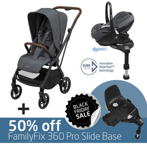 We constantly innovate to make parent’s lives easier. The FamilyFix 360 Pro is the only car seat base that rotates and slides toward you using Maxi-Cosi’s patented SlideTech® technology. Our revolutionary sliding car seat technology makes getting your child in and out of the car, easier than ever before. No backache, head bangs or struggles; simply lock, slide, spin and go! Built to the highest i-Size safety standards, the FamilyFix 360 Pro base offers safe travel from birth up to 4 years old when used with compatible car seats. ISOFIX installation makes for safe, fast and easy installation. Visual indicators on the base notify you so that you know when your car seat is correctly installed. A smart anti-misuse rotation lock also gives parents peace of mind knowing your baby always travels safely in the rear-facing position up to approx. 15 months.