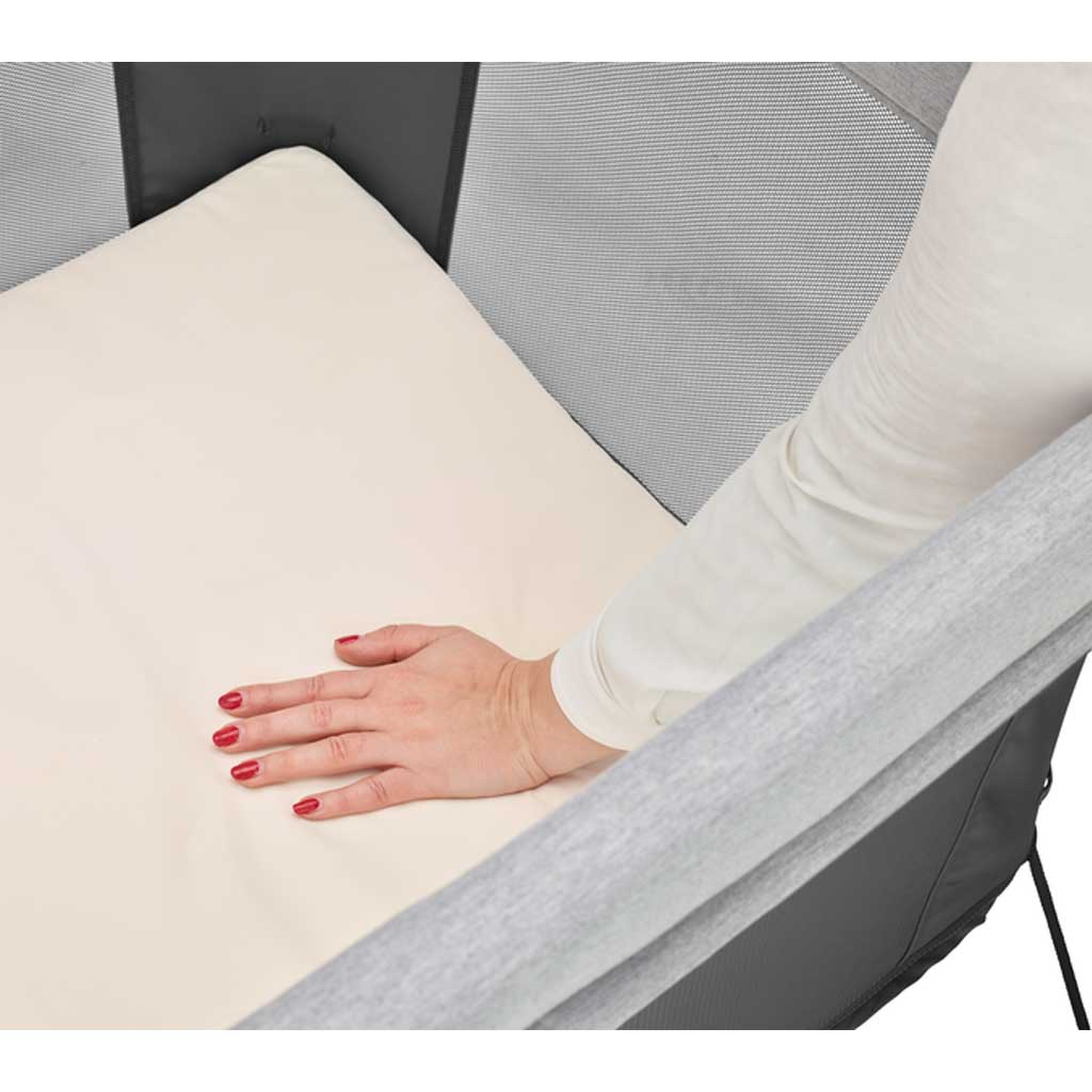 The Iris travel cot and mattress are adjustable to two different positions/heights. In the highest position (0-9kg), you can easily put your newborn down for a nap. And when they wake, you can pick up your baby without having to bend down all the way. Once your little one learns how to sit up or roll, switch the travel cot from a newborn travel cot to a toddler travel cot by moving the mattress to the lower position (0-15kg). Iris’ high sides ensure toddlers can’t climb out, while the mesh fabric on all sides of the travel cot allows you to keep an eye on your little one.