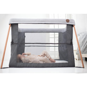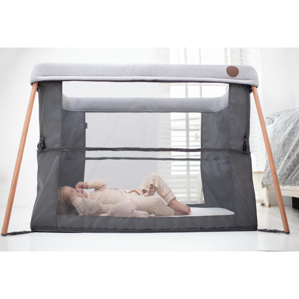 No need to compromise on appearances whilst out of your house or off on an adventure! The Iris compact travel cot is the best-looking travel cot out there. It’s available in elegant Essential Graphite with luxurious wood effect finishing's. The Iris travel cot has removable machine washable covers.