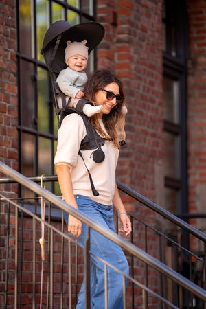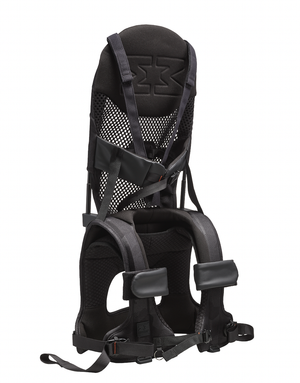 While discovering the world, your child sits safely on your shoulders secured by a waist belt and leg straps. A harness with shoulder straps is included to give extra upper body support for the smallest kids (6-10 months). An extendable padded seat provides maximum comfort for the child. The supportive backrest is designed to help the child sit up straight while sitting in the carrier on your shoulders.
