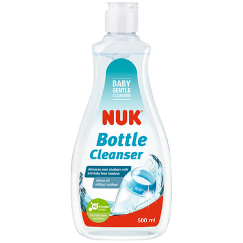 In the first months of life, a baby's food is first and foremost milk and puree. After feeding, leftovers remain on bottles, teats, cups and plates and germs, bacteria and bad smells can build up there. The NUK Bottle Cleanser was specially developed for cleaning baby products. The formulation is made up of nature-based ingredients: particular enzymes reliably remove any leftover milk, puree or juice. The NUK Bottle Cleanser has a thin consistency making it disperse quickly. The leftover proteins are cracked open by the enzymes and can be easily rinsed away completely. The NUK Bottle Cleanser is free of scents and colorants. This means you can clean baby cups and plates, washable toys and other things that come in contact with you baby's mouth - without a second thought and in a way that's right for babies.