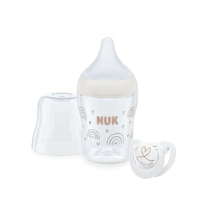 The NUK Perfect Match Baby Bottle 150ml is specially designed for newborns from 0 months, combining comfort, safety, and convenience. Featuring a soft, flexible silicone teat accepted by 98% of babies, this bottle ensures a natural, relaxed feeding experience. With anti-colic technology, temperature control, and a leakproof design, its perfect for everyday use. Plus, the adorable Rainbow design and included NUK Star Soother make it a practical and charming choice for both parents and babies.