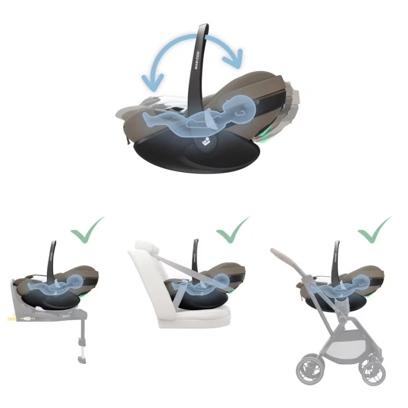 When moving from street to the car, you want your little one to stay comfortable and safe! No worries with our Pebble 360 Pro, the baby car seat that completes this comfortable and efficient travel system. The Pebble 360 Pro delivers maximum sleep comfort for your baby, from birth to 15 months. The seat features three recline positions (including a superior full lie-flat position) which can be used in the car and attached on a pushchair. The lie-flat position offers a more natural sleeping position for babies, as it helps keep their airways open and allows them to breathe more easily. When used with the rotating FamilyFix 360 Pro slide out base (sold separately), you can effortlessly rotate and slide your child toward you. The Easy-in harness adds even more convenience, allowing you to fasten your baby in with minimum fuss. On the road, Maxi-Cosi’s integrated G-CELL Side Impact Protection provides superior safety.