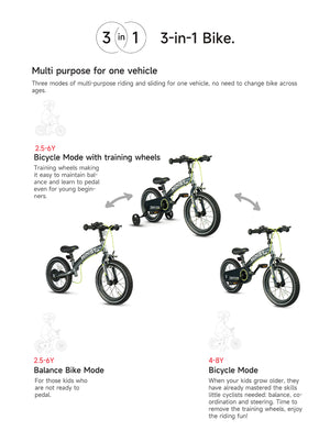If you want to buy just one bike, then our QPlay Miniby 3-in-1 bike is perfect for you! For children who are not yet ready to pedal, it can be used as a balance bike. As they get older, our QPlay Miniby can be switched to BIKE MODE. This bike is based on children's ergonomics. A larger side wheel makes it significantly easier to ride over obstacles and bumps. The height of the saddle and the handlebars can be adjusted as your little one grows.