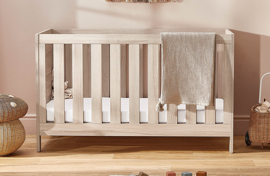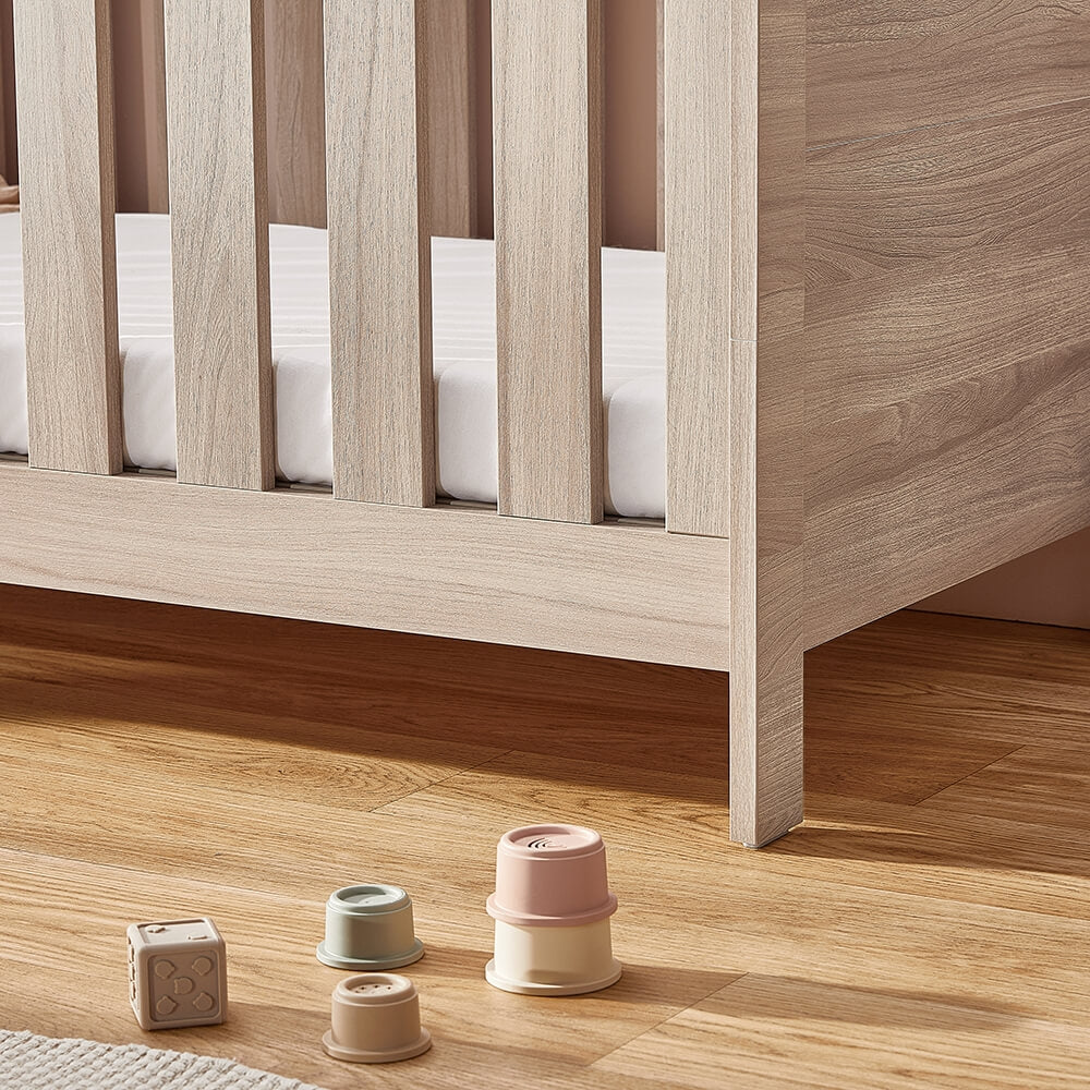 The clean lines of the Bromley Oak cot bed will fit seamlessly into any home. Expertly crafted from high-quality materials, it has a warm oak finish and coordinating handles.