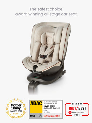 Silver Cross car seats are tested above and beyond regulation at European independent testing laboratories to ensure your child is safe and secure on every journey, at every age. Motion All Size 360 leads the way by meeting the latest R129/03 standard. Motion All Size 360 was named the best baby, toddler and child car seat in ADAC's 2022 Autumn Test, giving parents ultimate peace of mind.