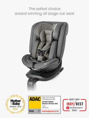Silver Cross car seats are tested above and beyond regulation at European independent testing laboratories to ensure your child is safe and secure on every journey, at every age. Motion All Size 360 leads the way by meeting the latest R129/03 standard. Motion All Size 360 was named the best baby, toddler and child car seat in ADAC's 2022 Autumn Test, giving parents ultimate peace of mind.