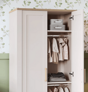 Create a tranquil and inviting nursery with the Seville wardrobe's soft cashmere finish, beautifully complemented by natural oak accents. This gender-neutral palette fits seamlessly into any home decor, whether your style is modern or classic. The elegant lines and soothing colours of the Seville wardrobe bring a touch of sophistication and calmness to your nursery, making it a delightful space for both you and your baby.