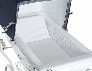 The pushing handle is finished in high gloss white with Silver Cross embossing.
