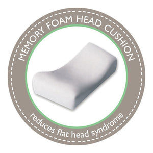 The memory foam head cushion gently contours to the shape and pressure of baby’s head, reducing the occurrence of flat spots or a misshapen head.