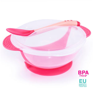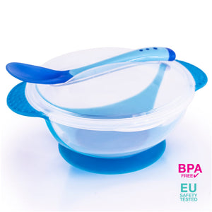 A durable and break-resistant bowl with suction base that helps baby advance to independent feeding. The bowl can be sealed with the fitted lid, keeping food free from contamination. The spoon is stored on the lid for safekeeping and hygiene