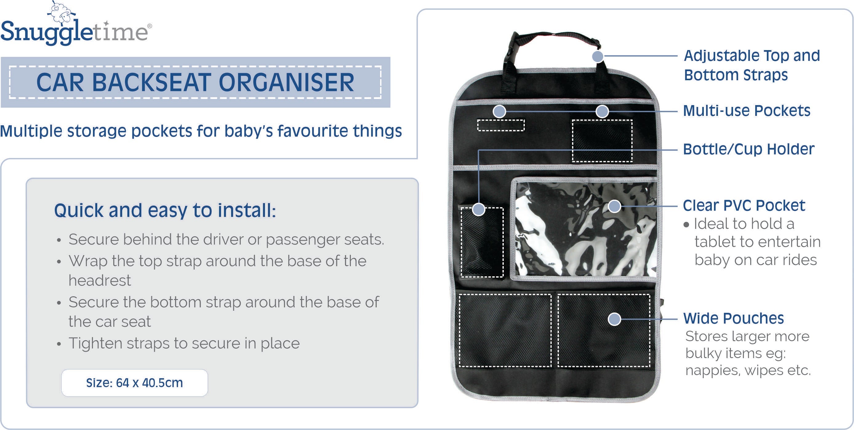 Quick and easy to set up. Fit the top strap around headrest and the bottom strap around the base of the seat. Tighten straps to secure in place. Durable fabric easy to clean, wipe with a damp cloth. Transparent top pocket to store and easily identify baby's favorite. Three easily accessible bottle/cup buddies. Wider bottom pouches easily stores books, nappies, wipes etc. Adjustable top and bottom straps for the perfect fit