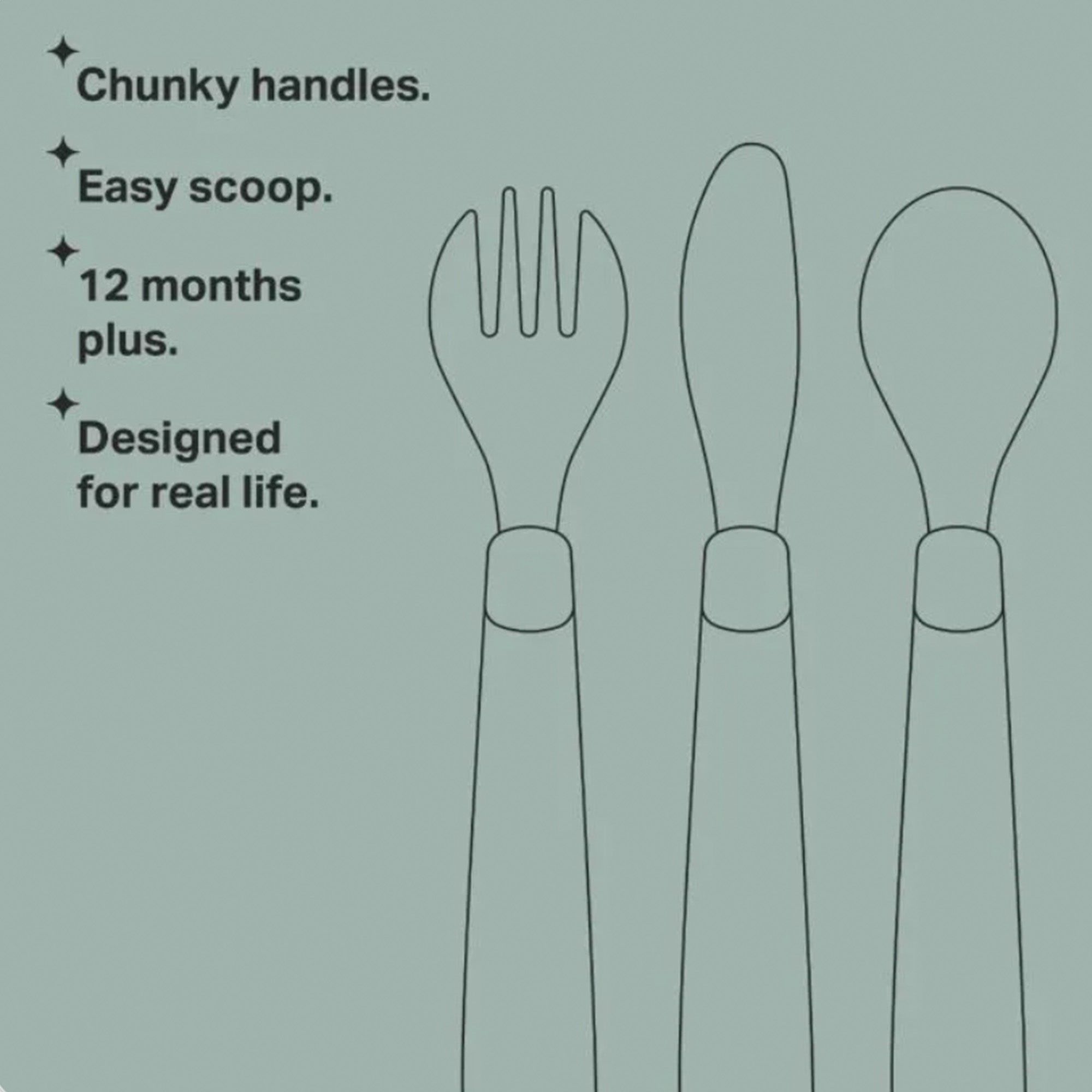 The chunky handles make these utensils easy to pick up and grip whilst the wide design of the spoon makes scooping easy. The extra depth helps them to keep more food on the spoon – so they get more in their mouth and less on the floor!