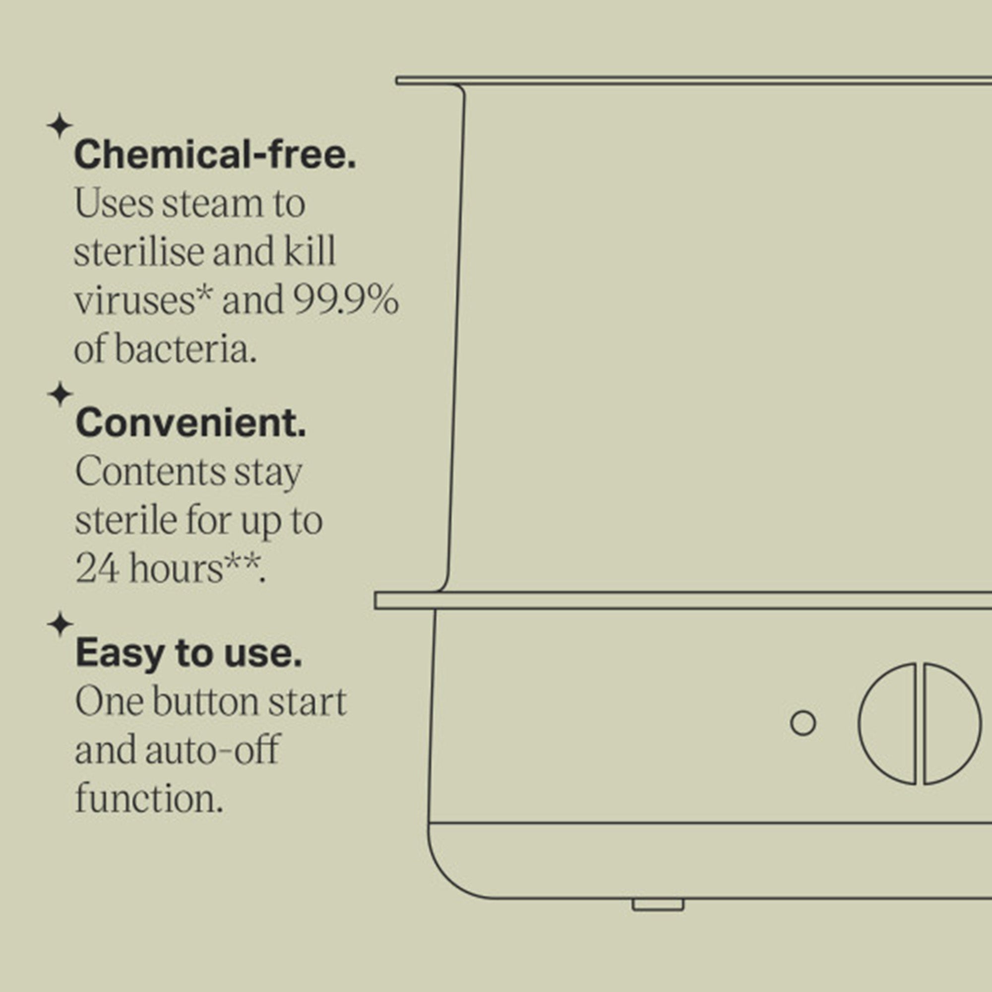 - Save time and stay organised: When the lid is closed properly, freshly steamed contents stay sterile for up to 24 hours, so you can sterilise your bottles and other feeding accessories in advance.