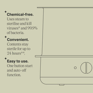 - Kills viruses and 99.9% of bacteria: Our steriliser uses natural steam to kill 99.9% of harmful bacteria & viruses, meaning you can protect your baby without using chemicals.