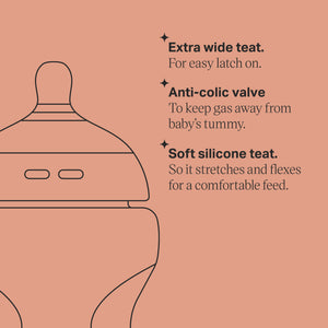 The original extra-wide teat is designed for an easy latch, helping babies feed at their own pace. Made from soft, flexible silicone, it stretches and flexes for a comfortable feeding experience. The built-in anti-colic valve reduces gas and discomfort, while the speedy self-sterilising feature allows for quick cleaning in just three minutes in the microwave. The bottle is 100% leakproof with the secure lid, even when turned upside down, and is completely BPA-free for peace of mind.